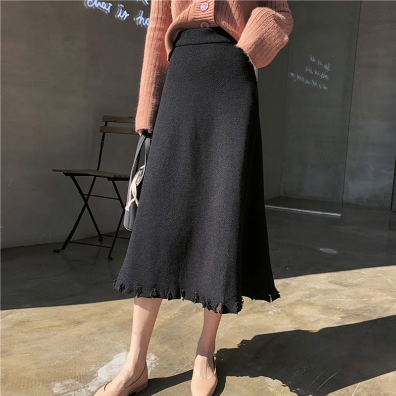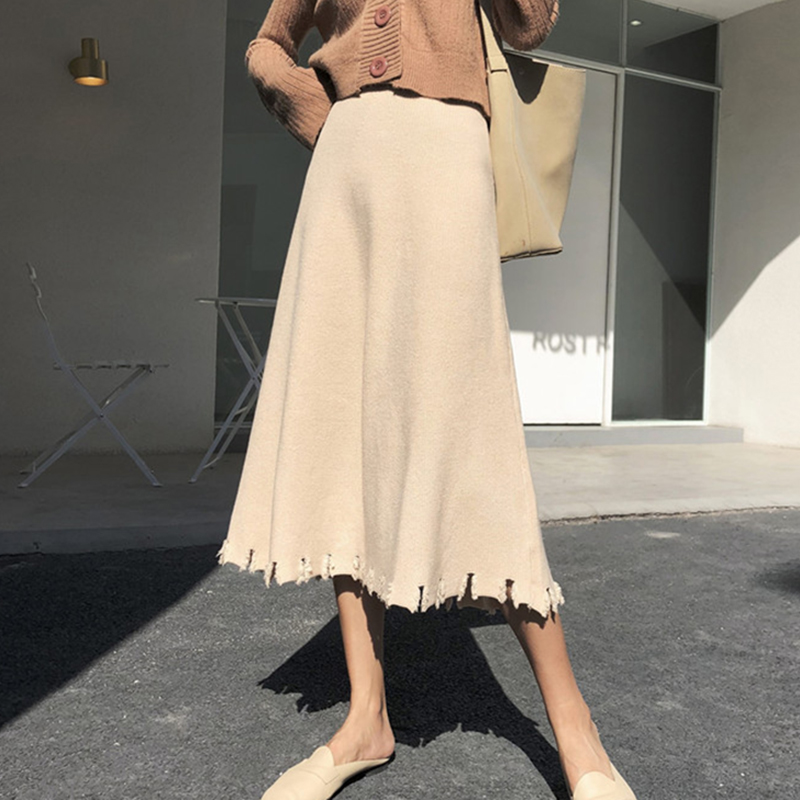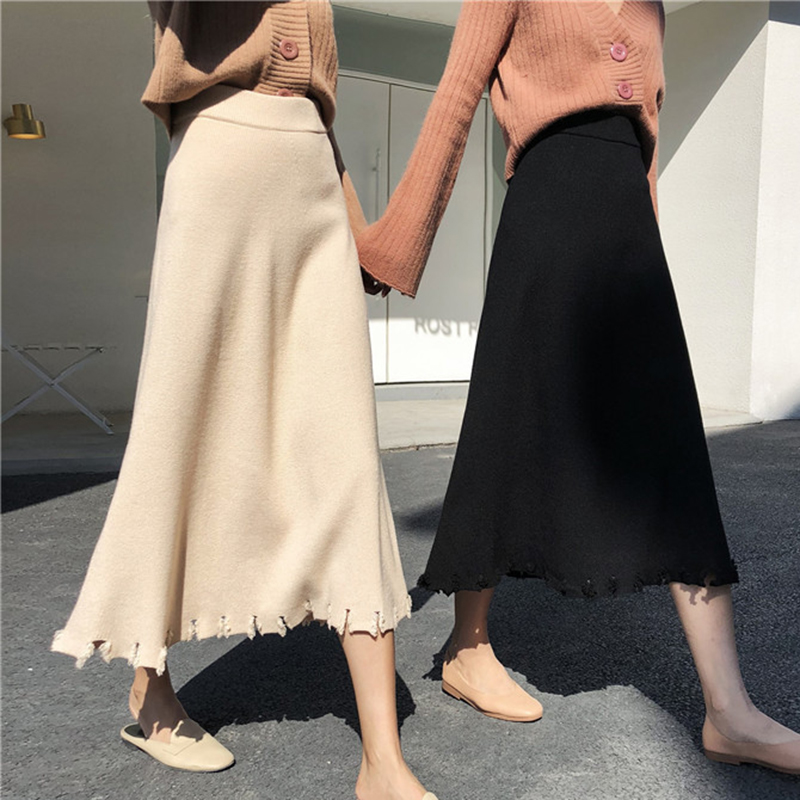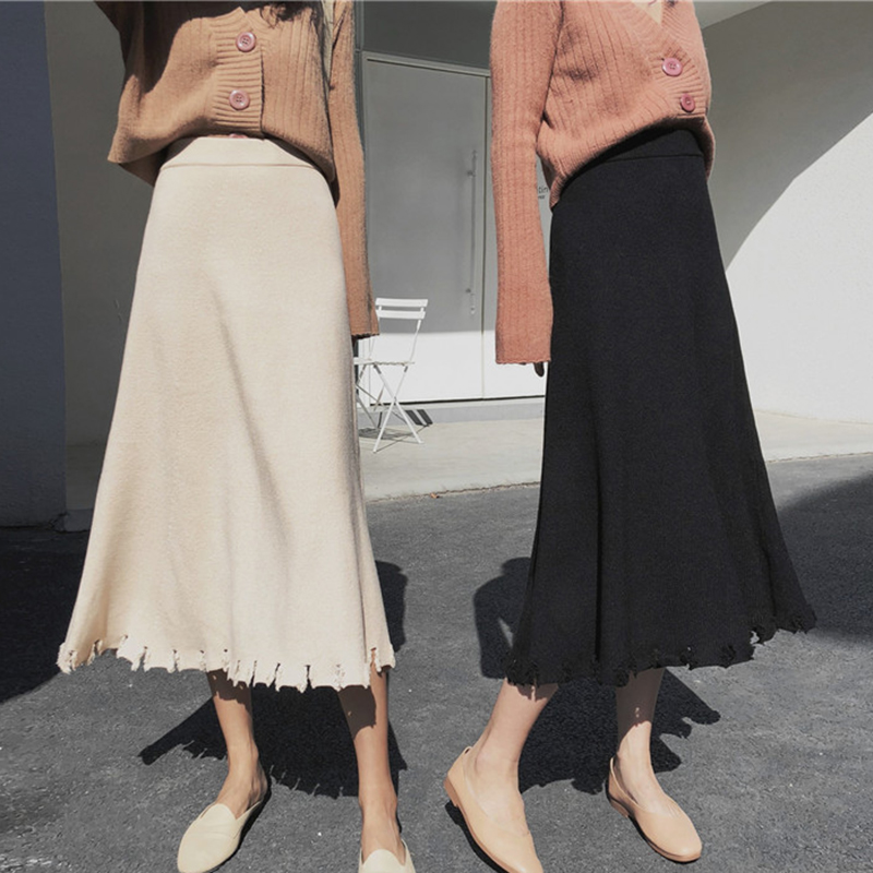 秋季女裝2018新款韓版chic半身裙高腰針織中長裙學生毛邊A字裙子