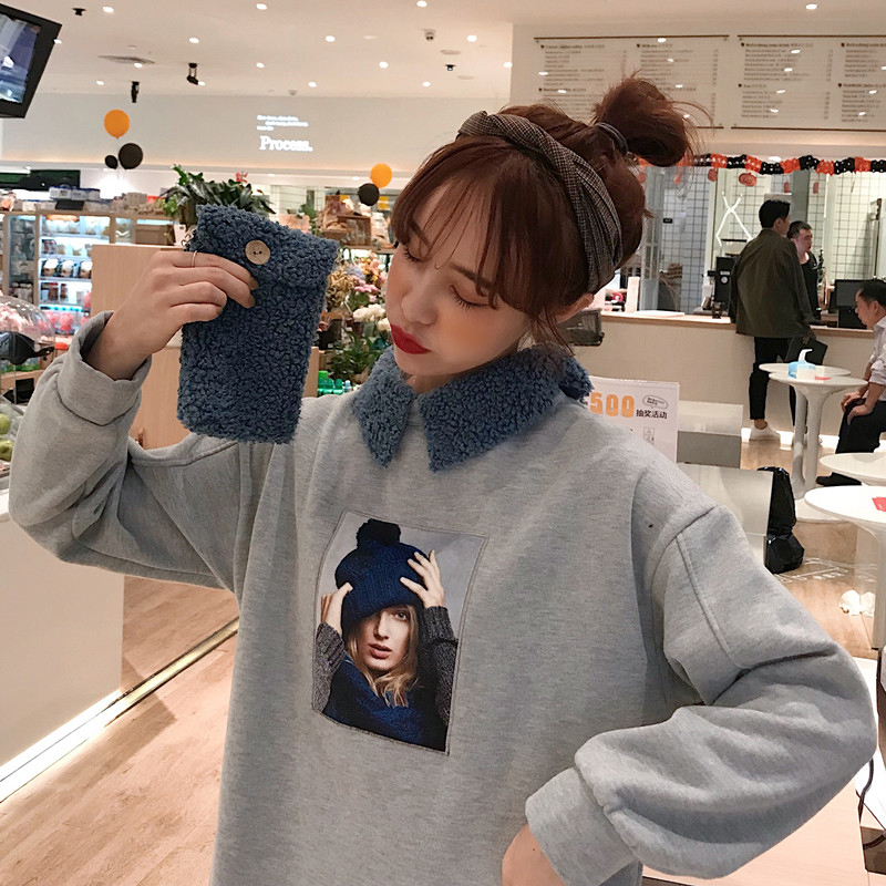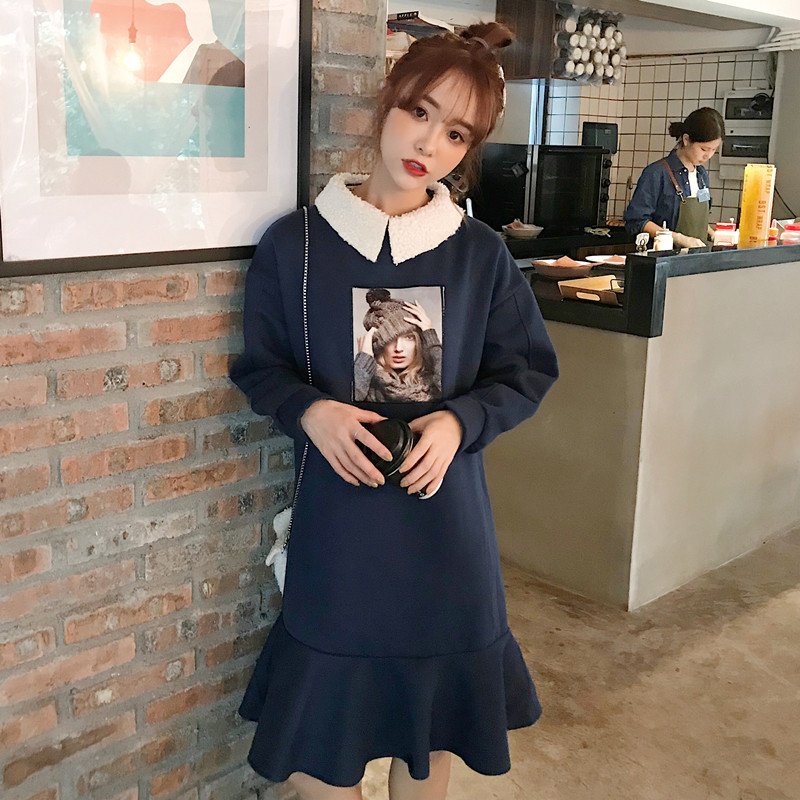 / 時尚印花加絨egg風連衣裙子女秋冬裝新款學生寬松荷葉邊A字衛衣裙