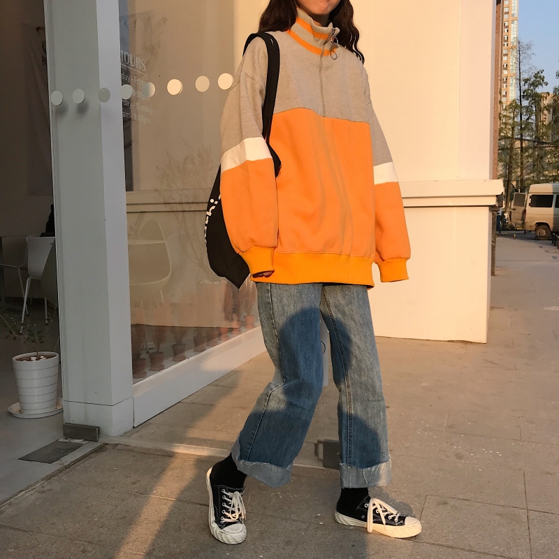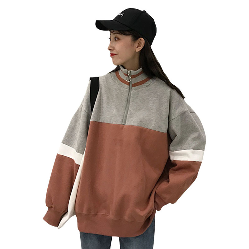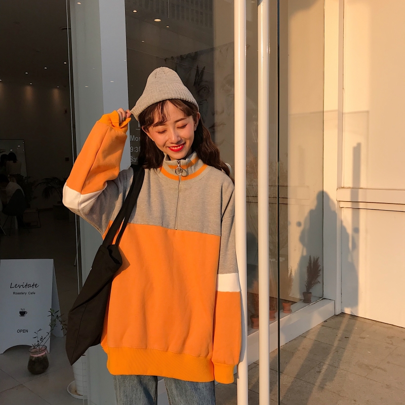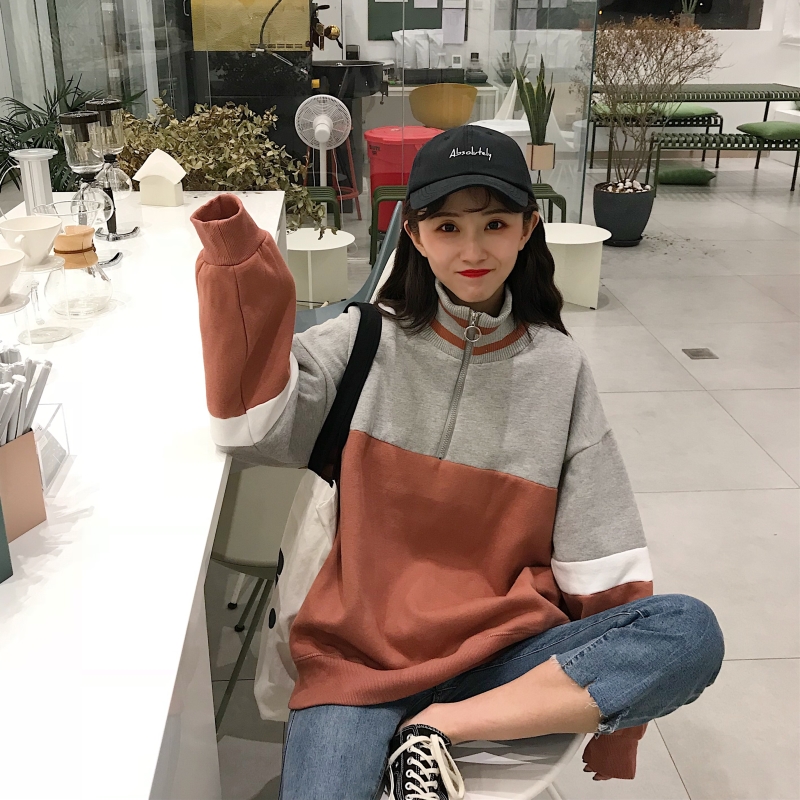 2018新款秋冬女裝韓版寬松加絨加厚拼色高領套頭超火衛衣上衣外套