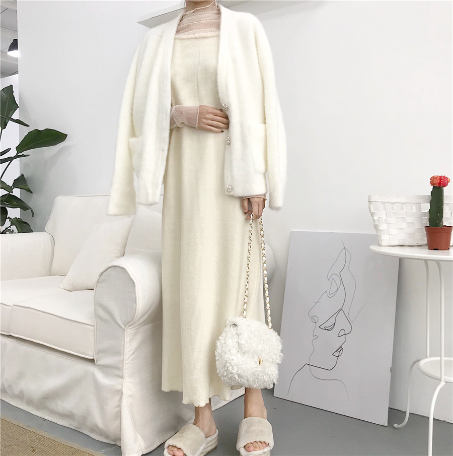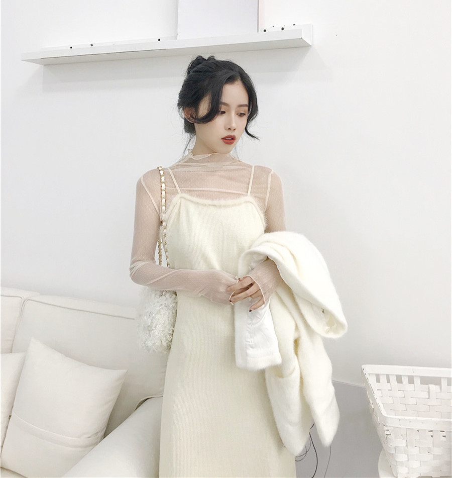 甜美時尚新款套裝親膚蕾絲網紗打底毛毛邊吊帶針織連衣裙長裙女潮