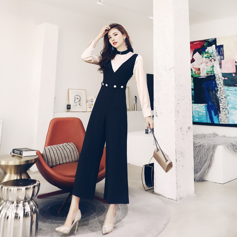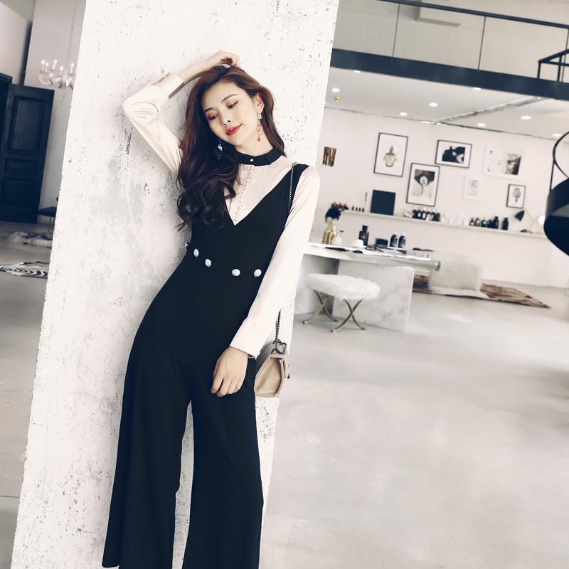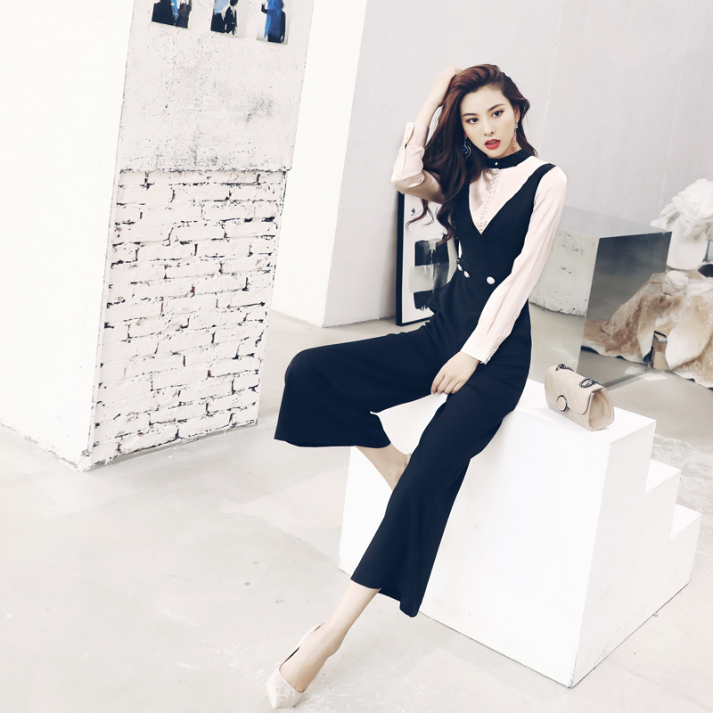 2018新款秋裝兩件女韓版長袖上衣顯瘦高腰背帶連體闊腿褲時髦套裝