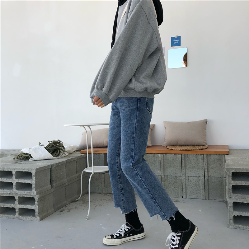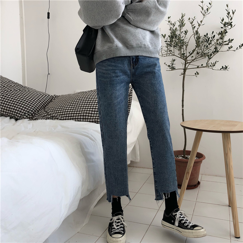 / 秋裝女裝韓版寬松水洗高腰百搭褲腳缺口九分褲牛仔褲直筒褲長褲潮