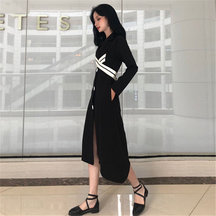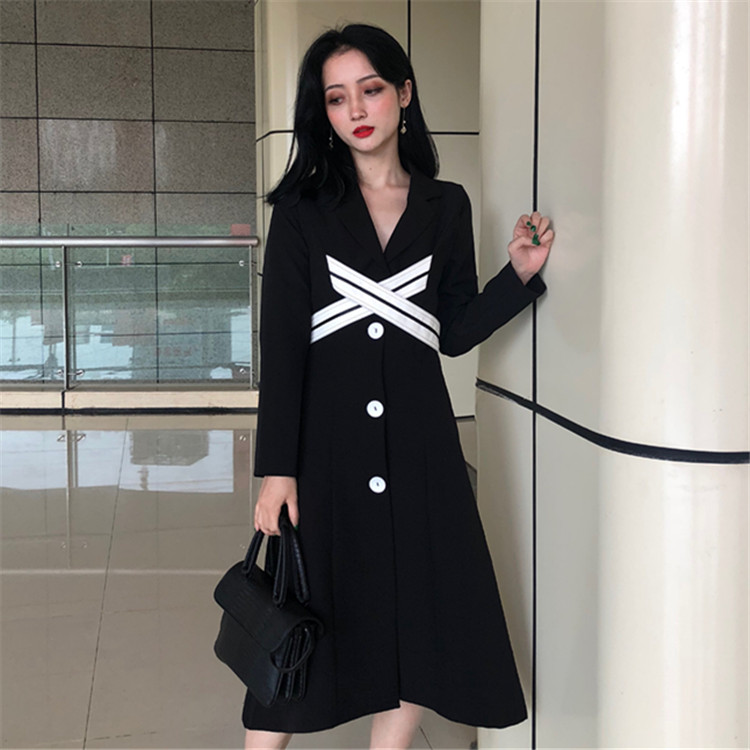 2018新款韓版氣質收腰修身V領中長款裙子女長袖赫本黑色連衣裙秋