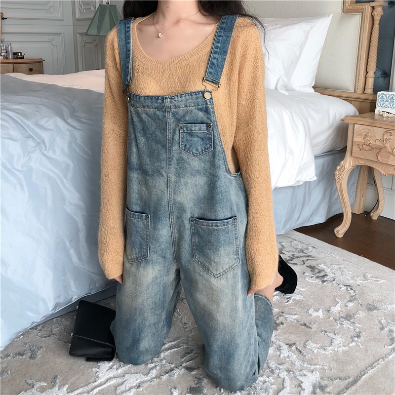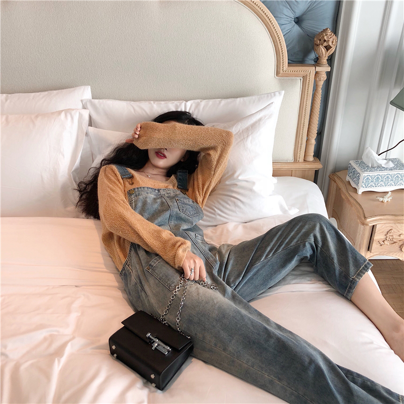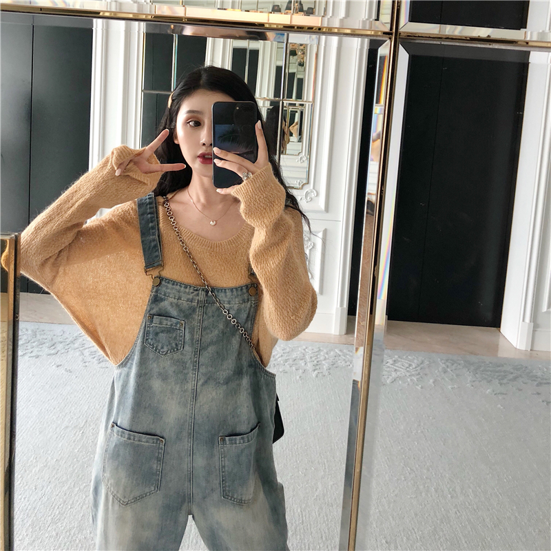 早秋chic毛衣牛仔褲背帶褲女高腰寬松九分褲時尚套裝小清新兩件套