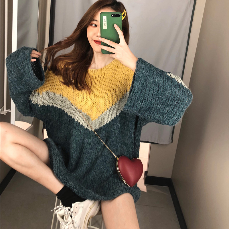 / 慵懶套頭毛衣女秋裝新款甜美撞色粗線針織衫學生寬松長袖外套上衣