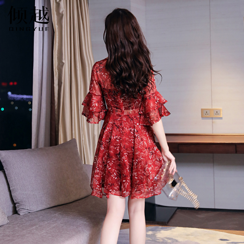 2017夏新款女裝韓版修身V領喇叭袖碎花雪紡連衣裙中長款顯瘦a字裙