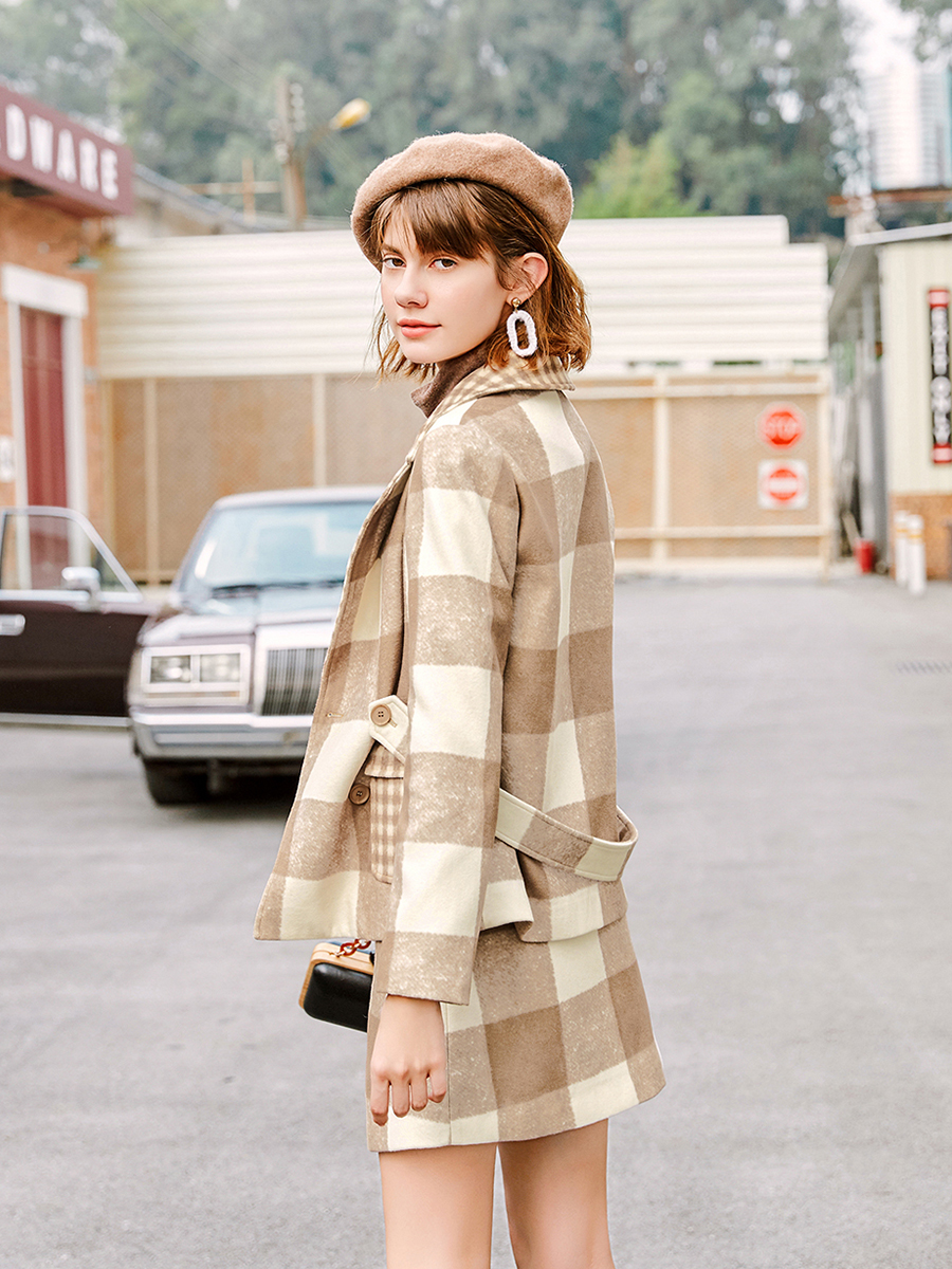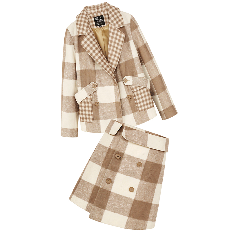 MG小象格子毛呢外套女秋冬新款高腰不規則短裙復古休閑呢子大衣潮