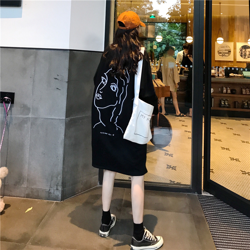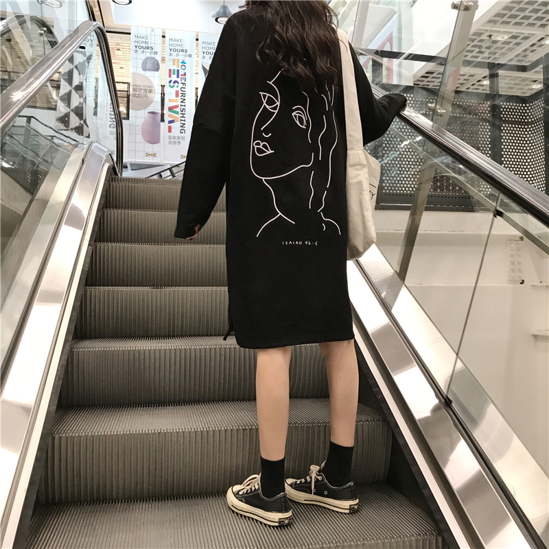 / 韓版時尚百搭秋裝女2018新款寬松顯瘦美女頭像印花字母中長款衛衣