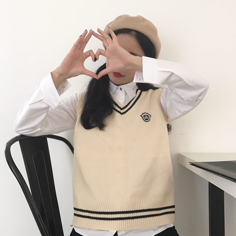 / 秋季女裝韓版學院風減齡徽章V領針織衫上衣寬松無袖馬甲背心外套