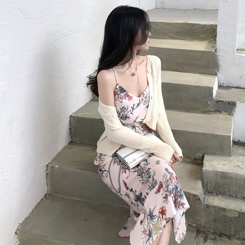 / 早秋新款兩件套裝女氣質綁帶碎花開叉吊帶連衣裙+長袖披肩短外套