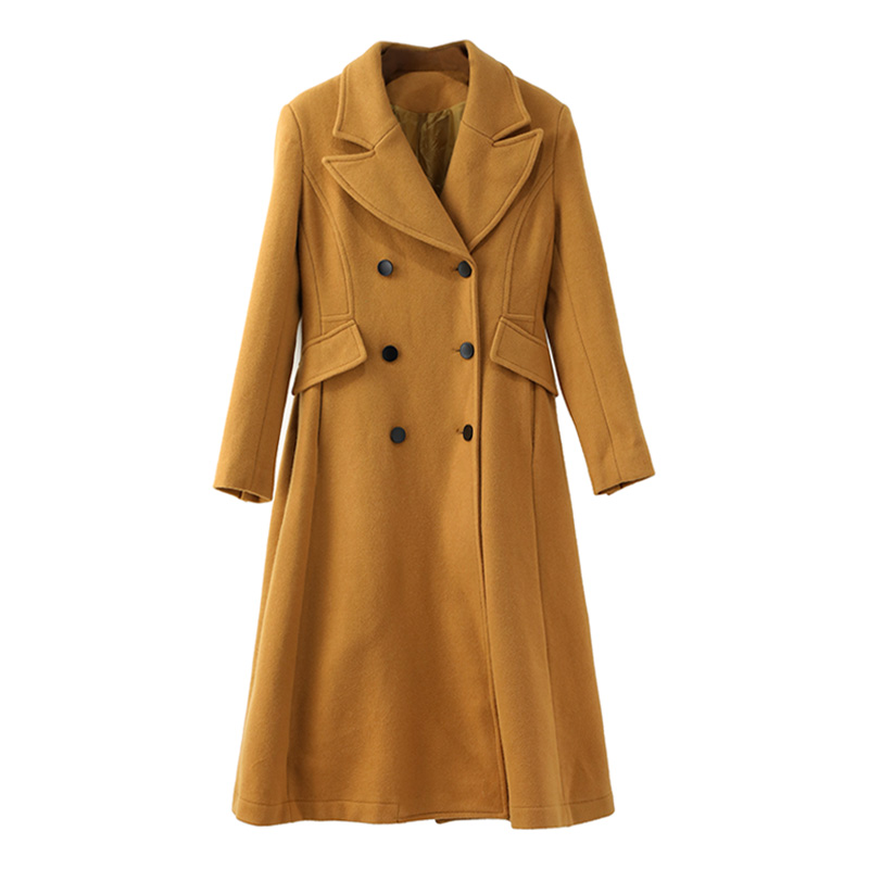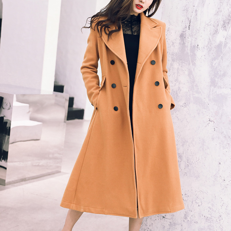 名媛氣質2018秋冬韓版風衣毛呢外套雙排扣中長款駝色收腰翻領大衣