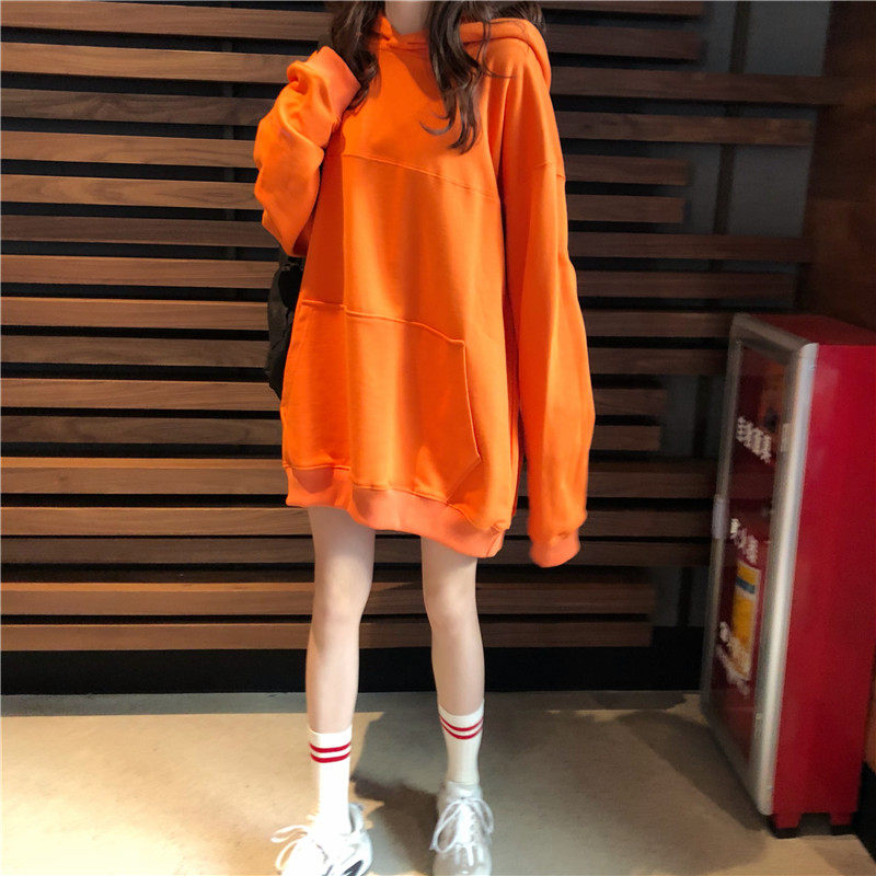 2018新款秋冬韓版寬松純色中長款連帽加厚加絨超火衛衣上衣外套女