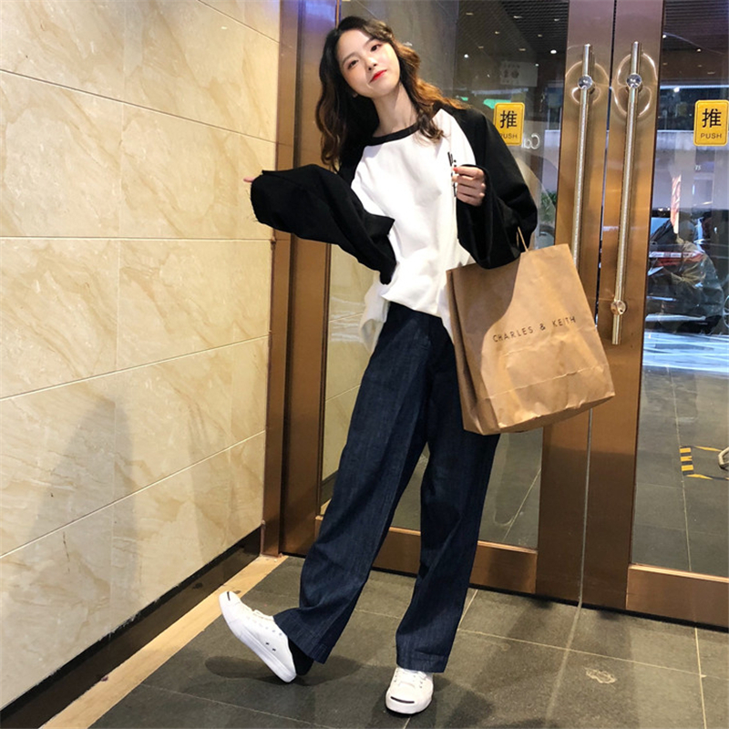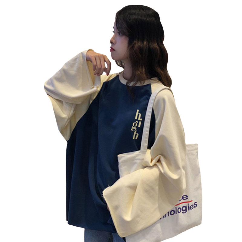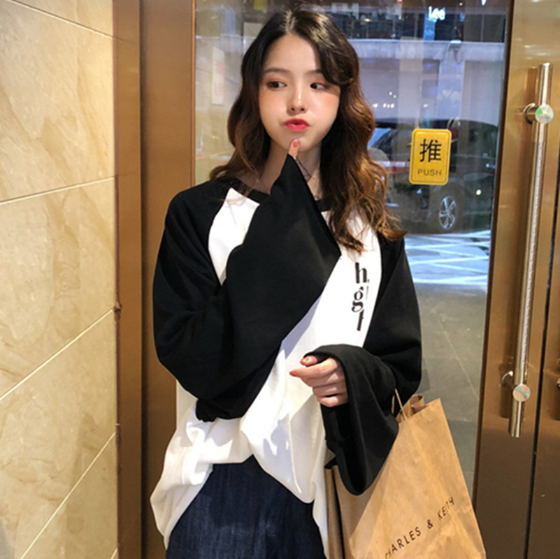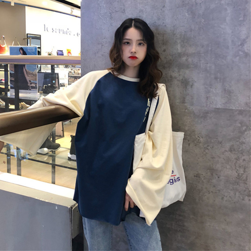 / 秋季韓版中長款原宿風寬松拼色字母插肩袖長袖套頭衛衣上衣外套女