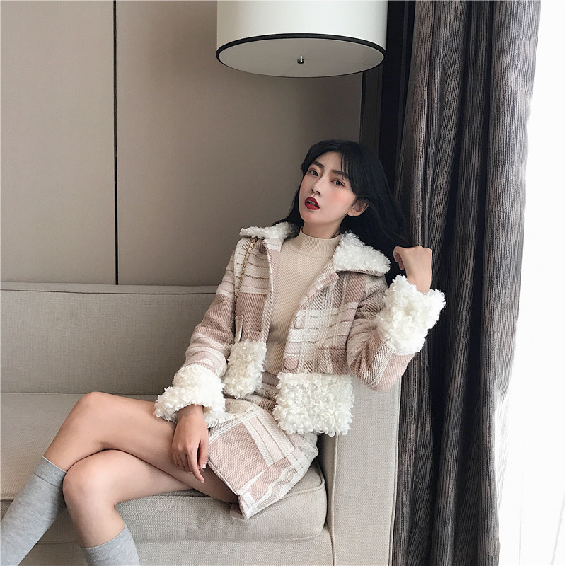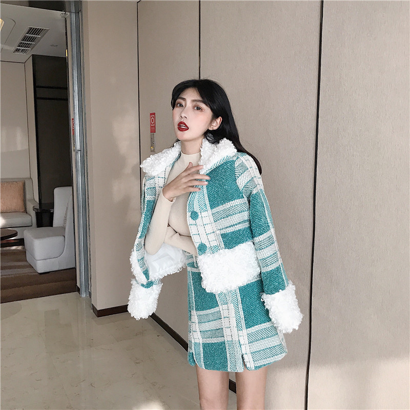 / 秋冬季時尚氣質羊毛呢子短款格子毛領毛呢外套女+毛呢半身裙套裝