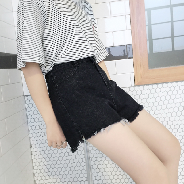 / 春秋女裝韓版高腰百搭牛仔短褲顯瘦闊腿褲毛邊黑色牛仔褲學生熱褲
