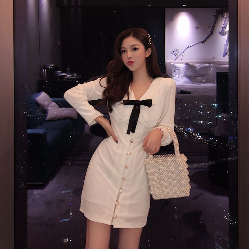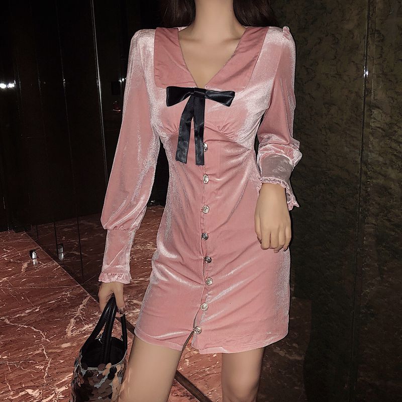 女神范女秋裝2018新款裙子單排扣蝴蝶結收腰顯瘦長袖絲絨連衣裙潮