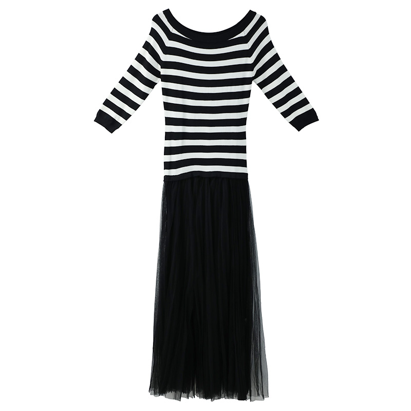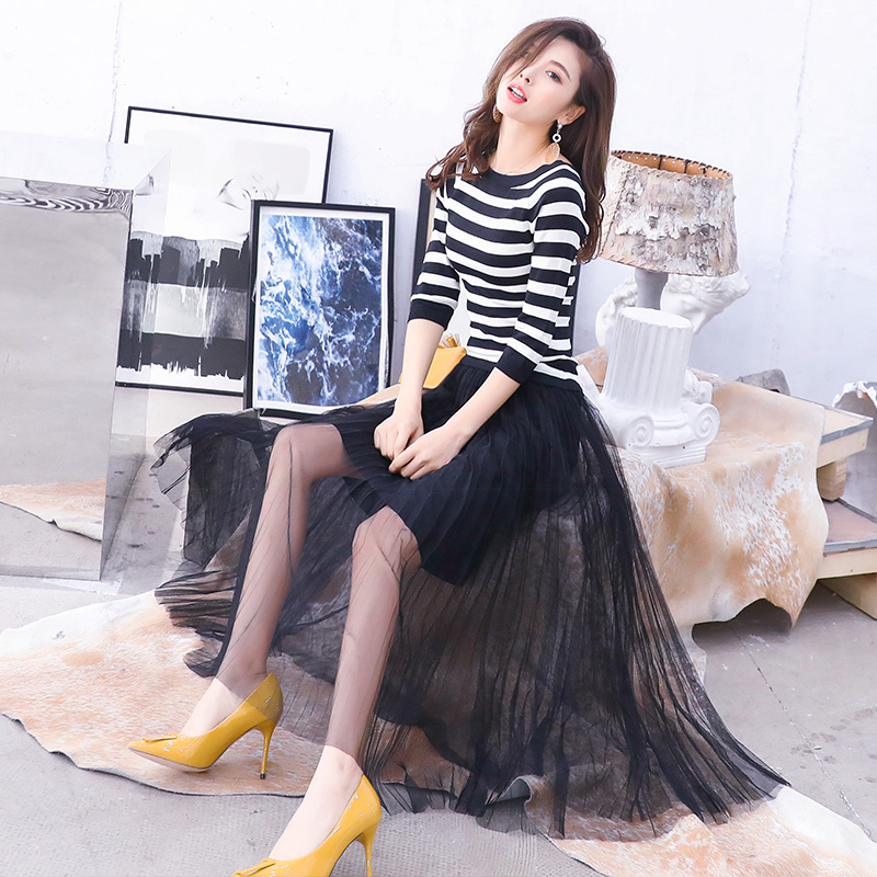 / 淑女氣質2018秋冬女裝新款針織A字裙拼接百褶網紗假兩件連衣裙子