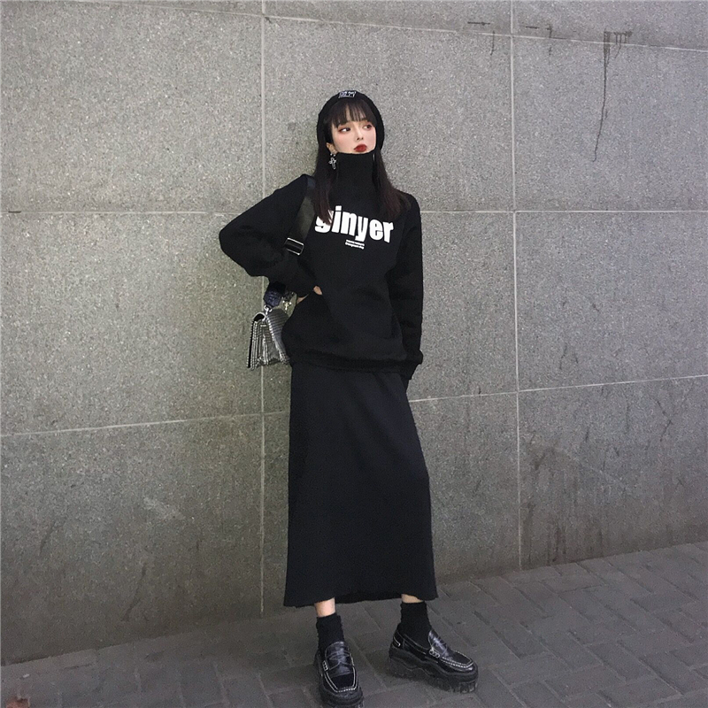 冬季女裝復古港風加厚毛線高領拼接假兩件字母套頭衛衣女2018新款