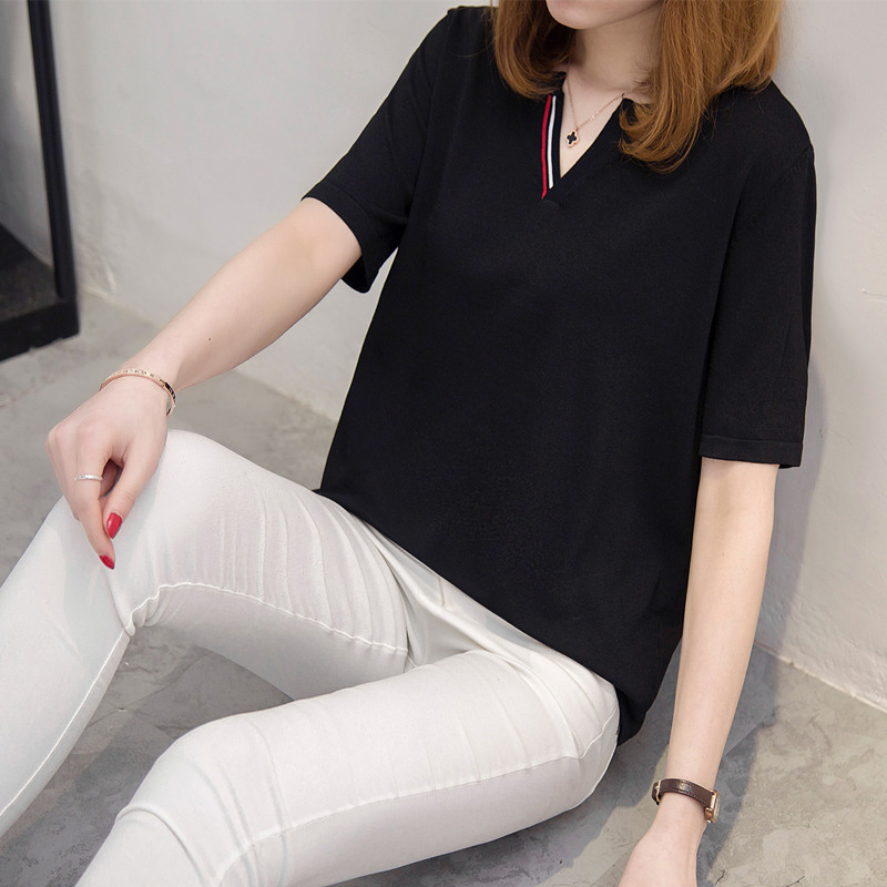 短袖上衣女夏新款V領白色針織衫女空調衫寬松韓版百搭打底