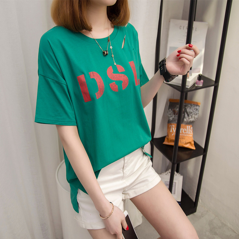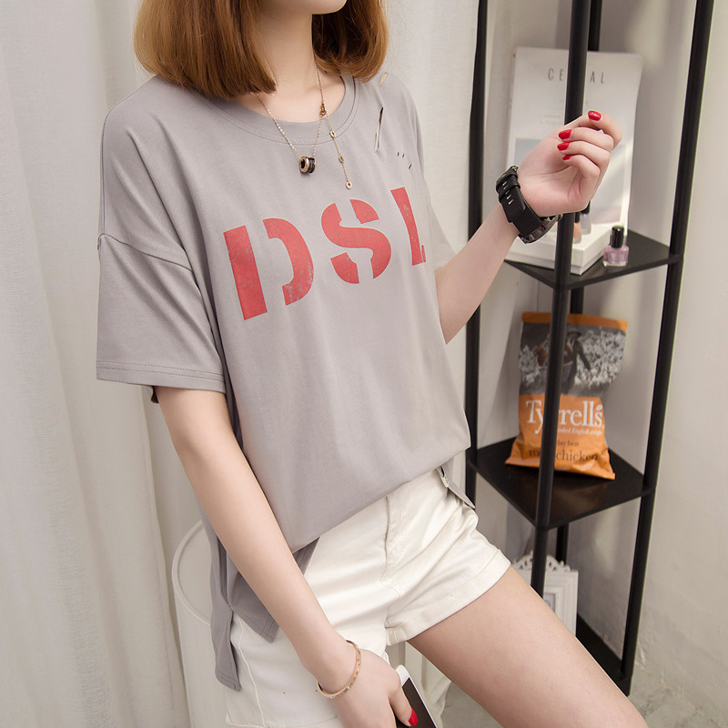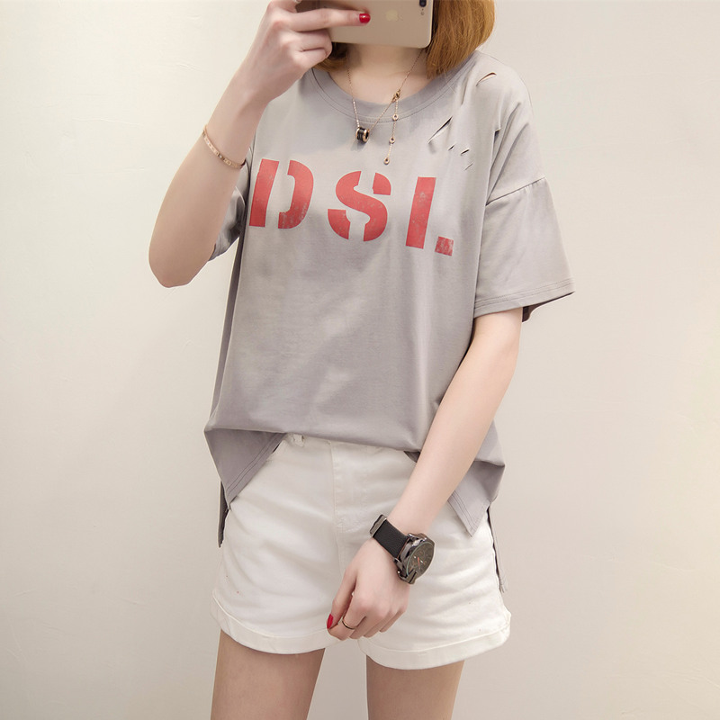 / 女裝春裝新款潮百搭打底個性體恤破洞短袖t恤女字母寬松小衫