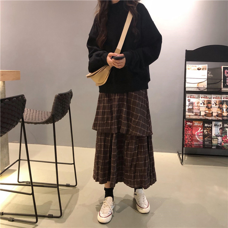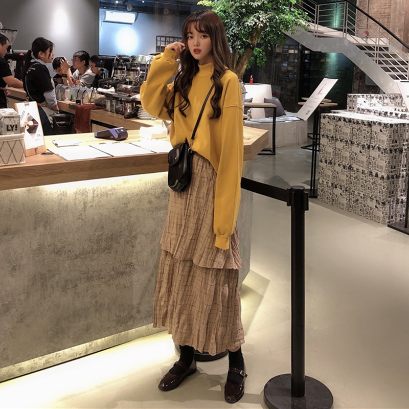 / 套裝女秋冬2018新款半高領衛衣慵懶風黑色外套高腰格子A字半身裙