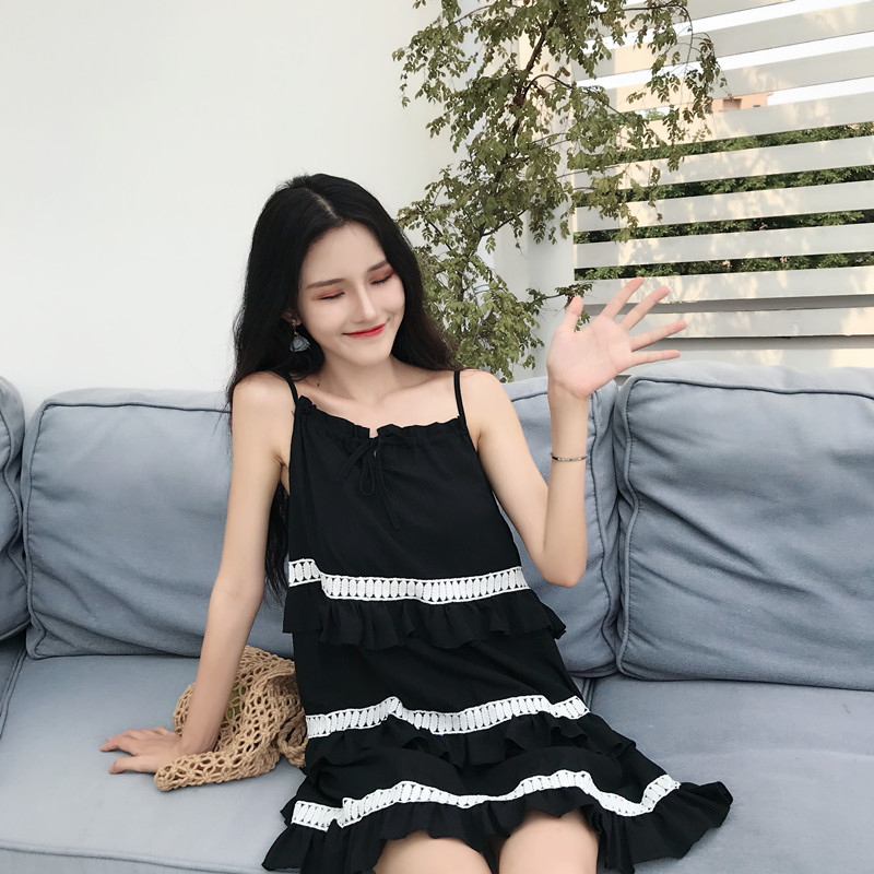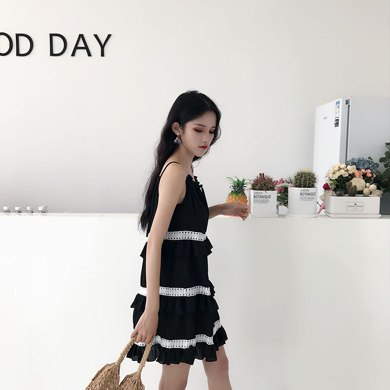 韓版小清新層層荷葉邊蛋糕裙甜美復古chic顯瘦露肩吊帶雪紡連衣裙