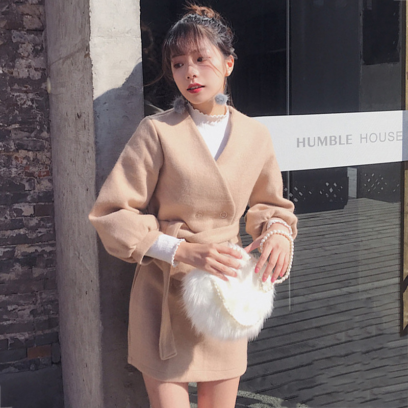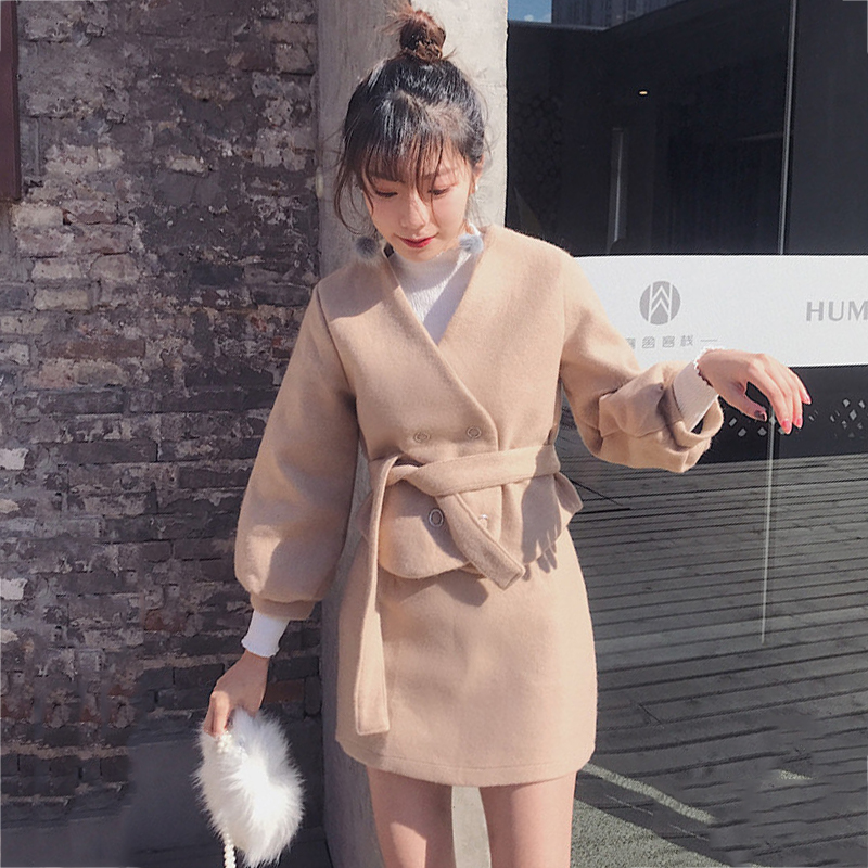 / 秋冬女裝新款長袖綁帶毛呢短外套開衫+高腰a字半身裙短裙子兩件套