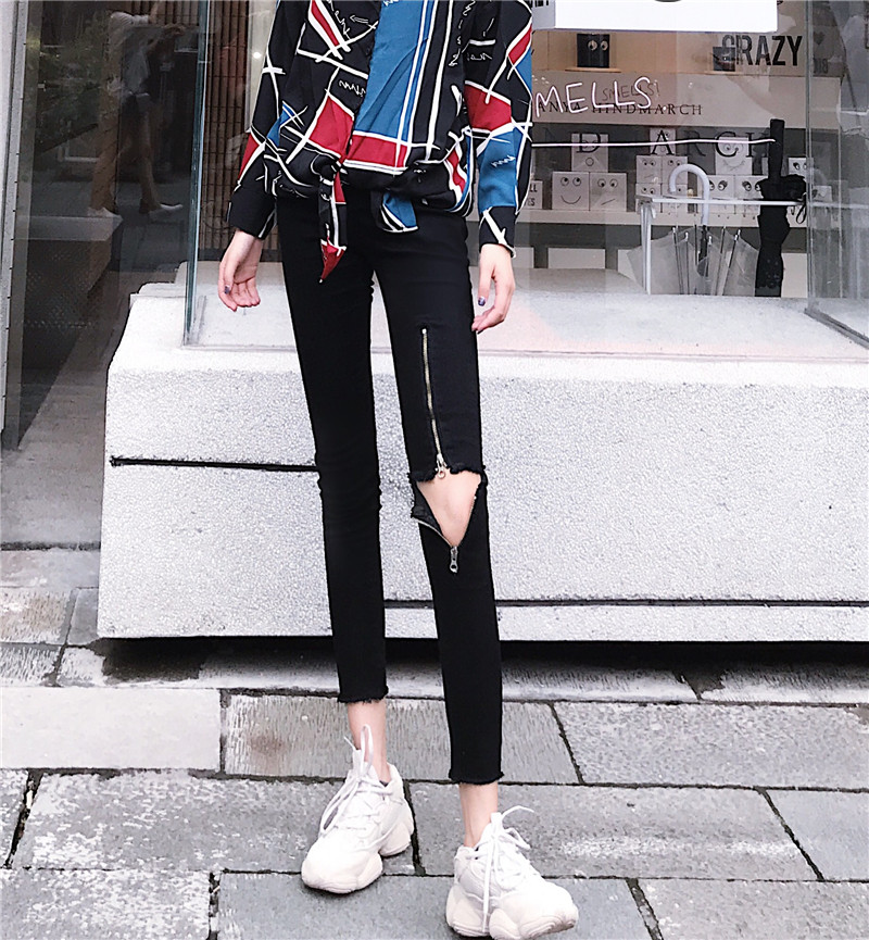 褲子女2018新款個性拉鏈膝蓋破洞時尚牛仔高腰緊身彈力九分小腳褲