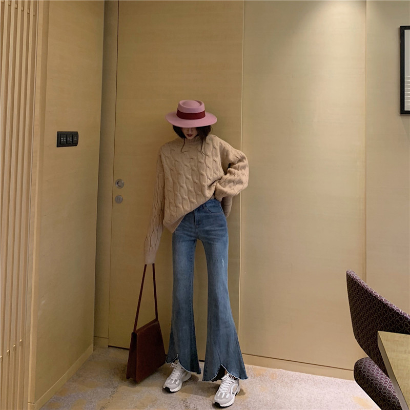 復古氣質喇叭褲高腰顯瘦不規則牛仔褲女春秋2018新款韓版學生長褲
