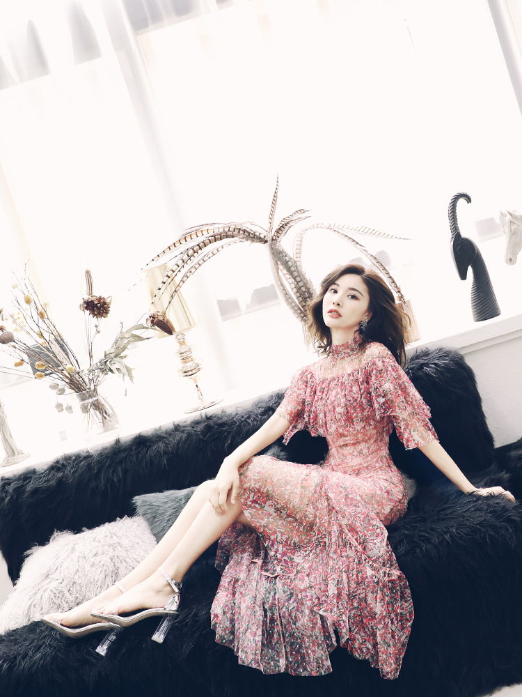/ S秀名媛2018夏季新款超仙網紅短袖荷葉邊網紗修身碎花長款連衣裙