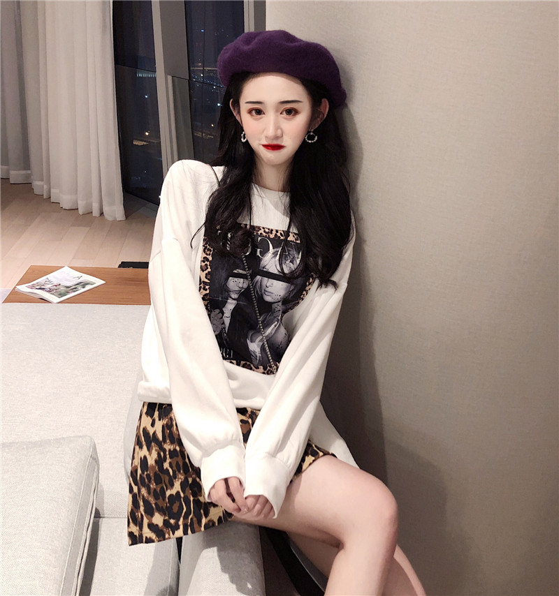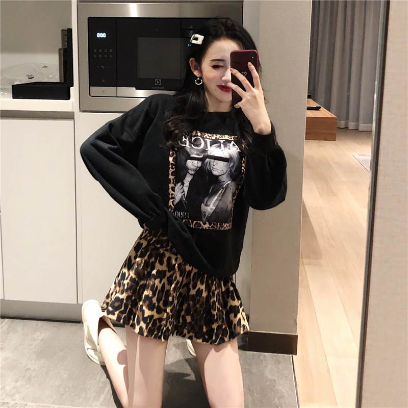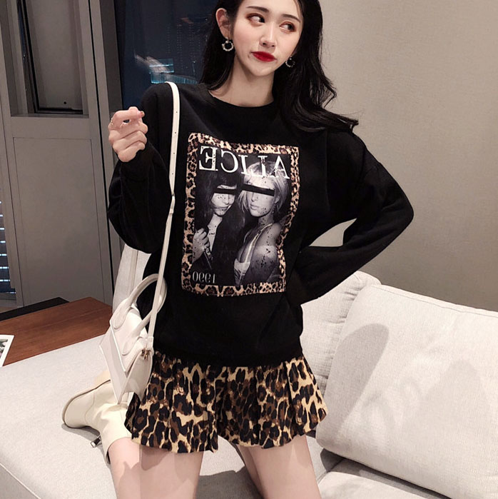 / 復古時尚百搭貼布印花衛衣女秋冬2018新款+百搭豹紋壓褶短裙套裝