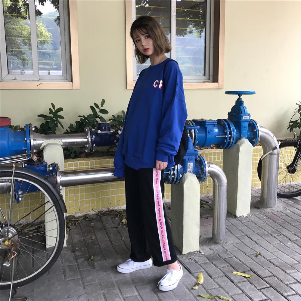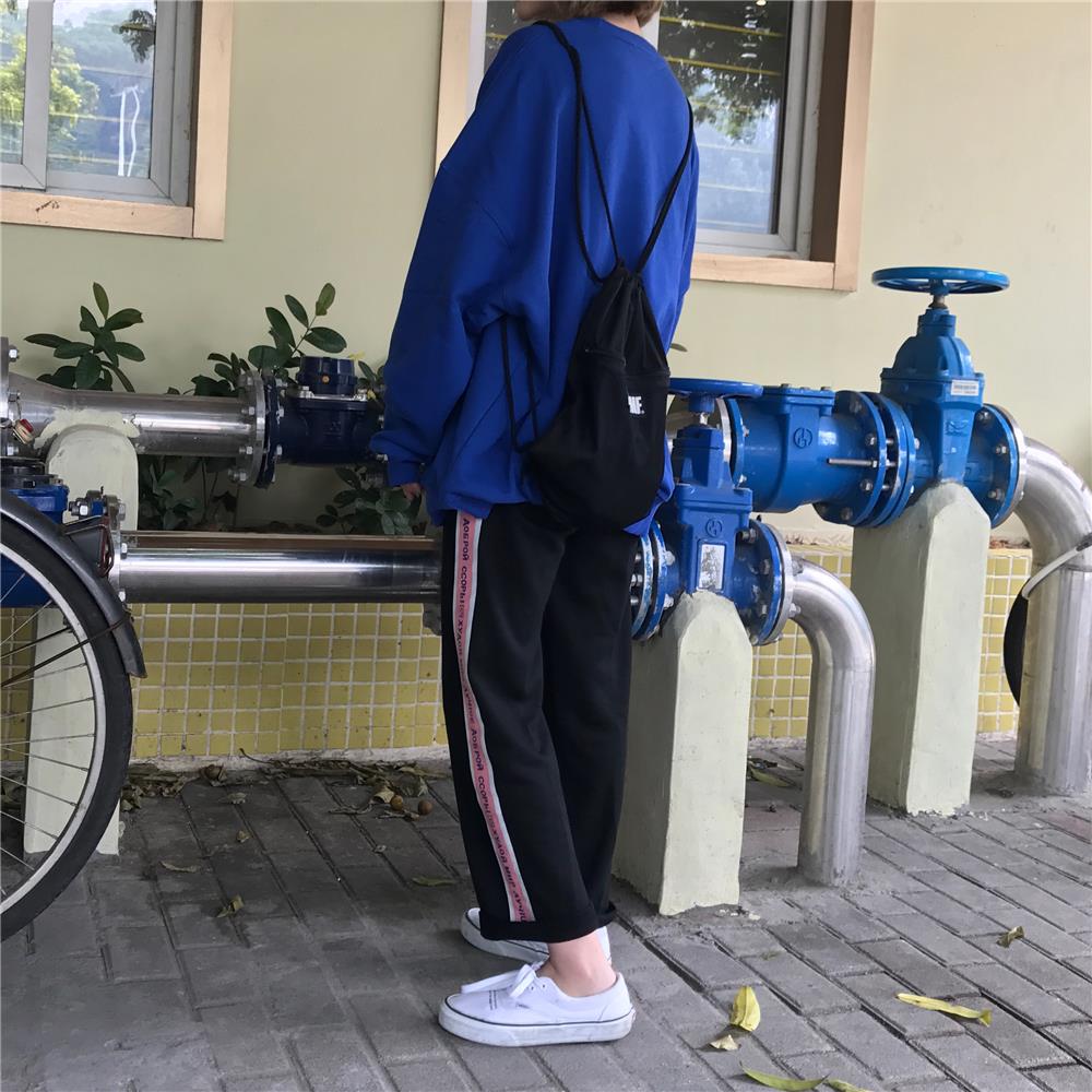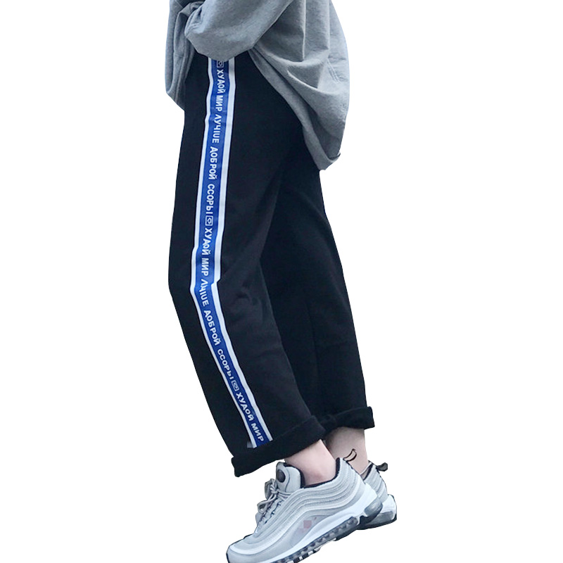 / 秋裝韓版原宿風寬松顯瘦松緊腰側邊字母運動休閑褲闊腿褲九分褲女