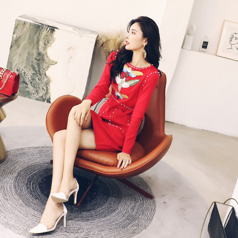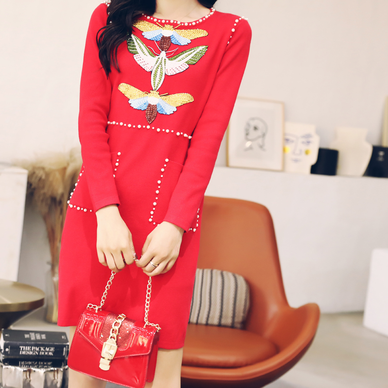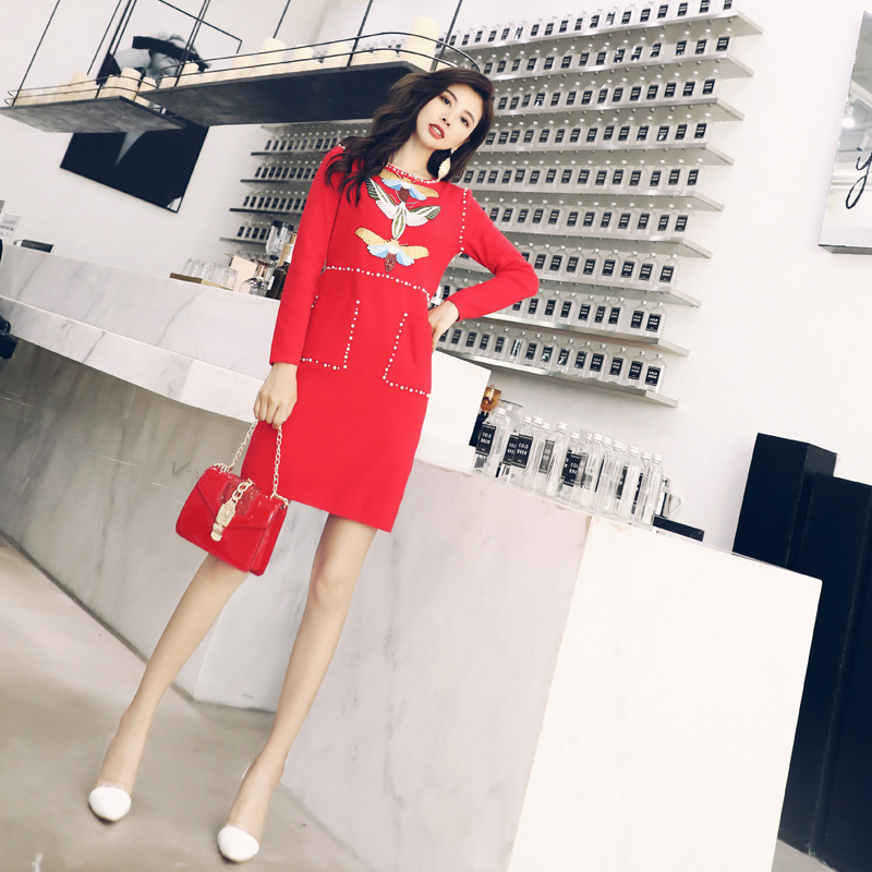 針織連衣裙早秋裝2018新款女裝氣質長款修身包臀釘珠重工一步裙子