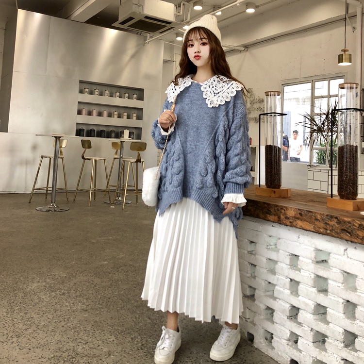 / 韓版時尚休閑套裝秋季寬松針織毛衣外套+花邊襯衣+百褶裙三件套女