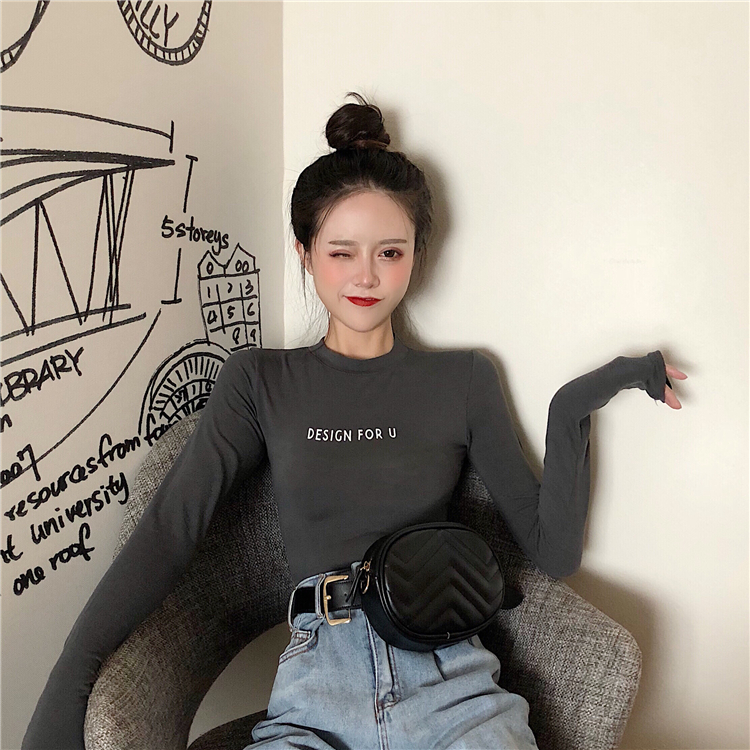 新款休閑秋裝顯瘦純色薄款百搭修身字母印花長袖T恤女打底衫上衣