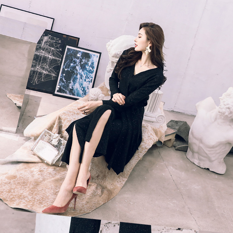 2018秋冬新款韓版長袖開衫休閑中長款收腰外套開叉長褲兩件套裝潮