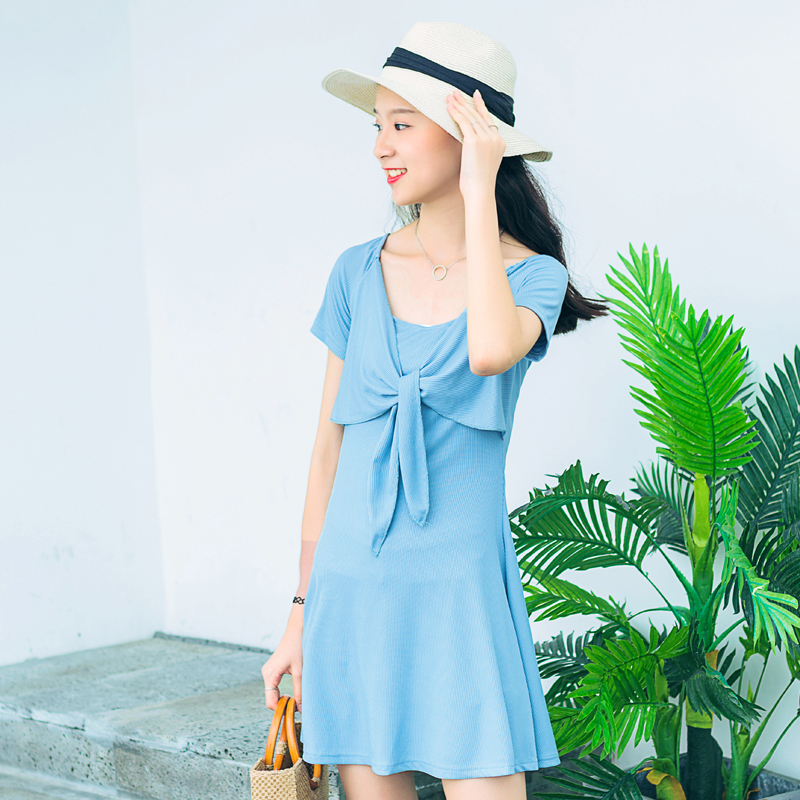 / 夏裝新款韓版時尚純色修身顯瘦綁帶兩面穿一字領露肩連衣裙女短裙