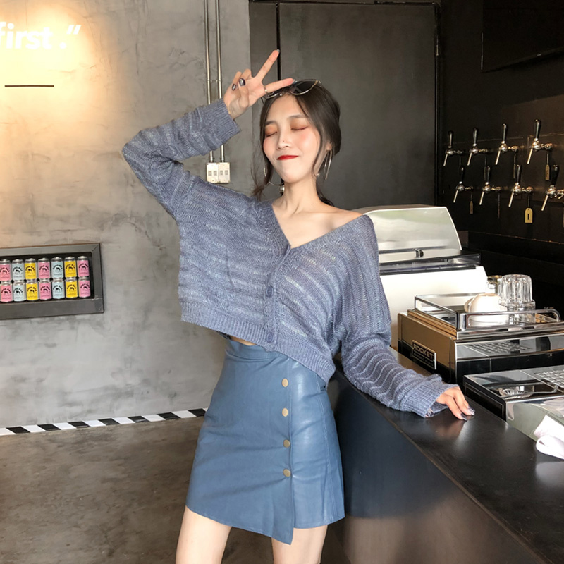 / 港味時尚套裝chic早秋上衣慵懶針織毛衣開衫+百搭高腰皮裙兩件套
