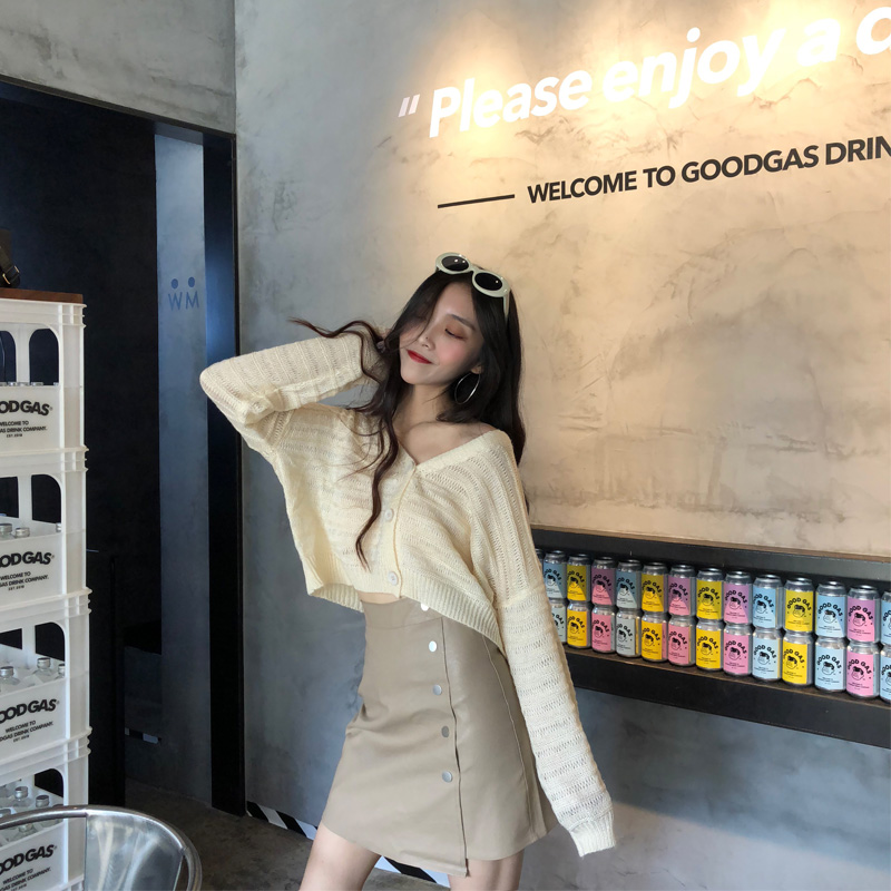 韓版chic早秋慵懶溫柔毛衣坑條V領一排扣喇叭袖純色百搭針織開衫
