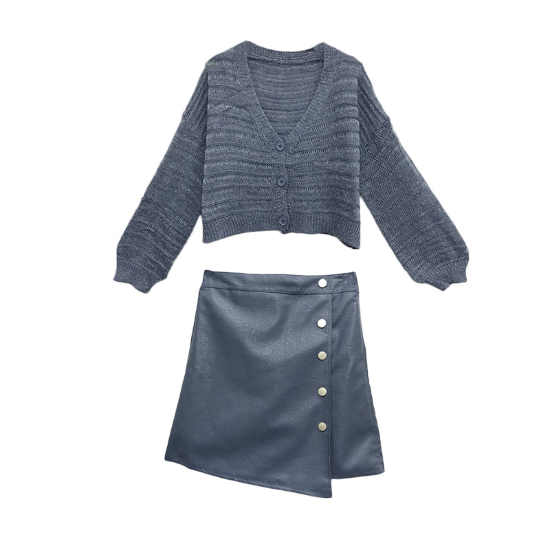 港味時尚套裝chic早秋上衣慵懶針織毛衣開衫+百搭高腰皮裙兩件套