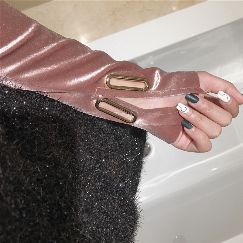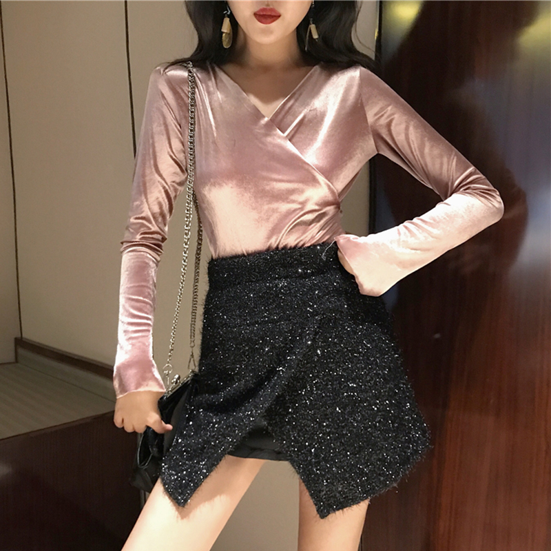 / 晚晚風套裝女秋裝2018新款亮絲不規則半身A字裙子修身絲絨打底衫