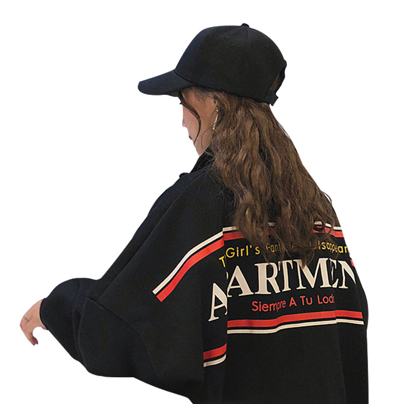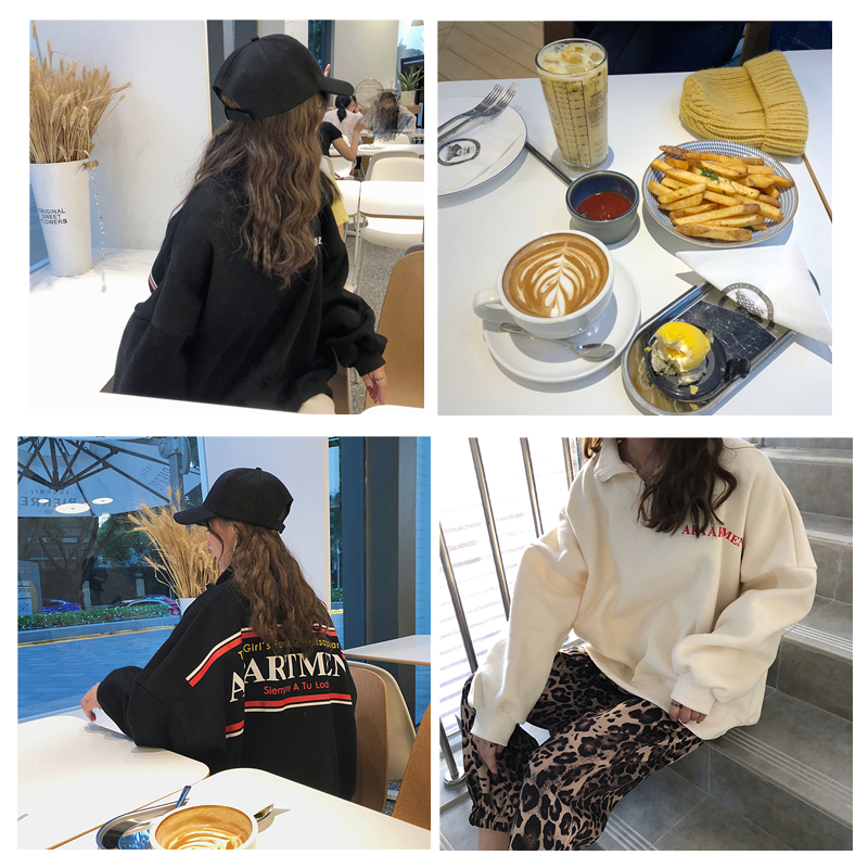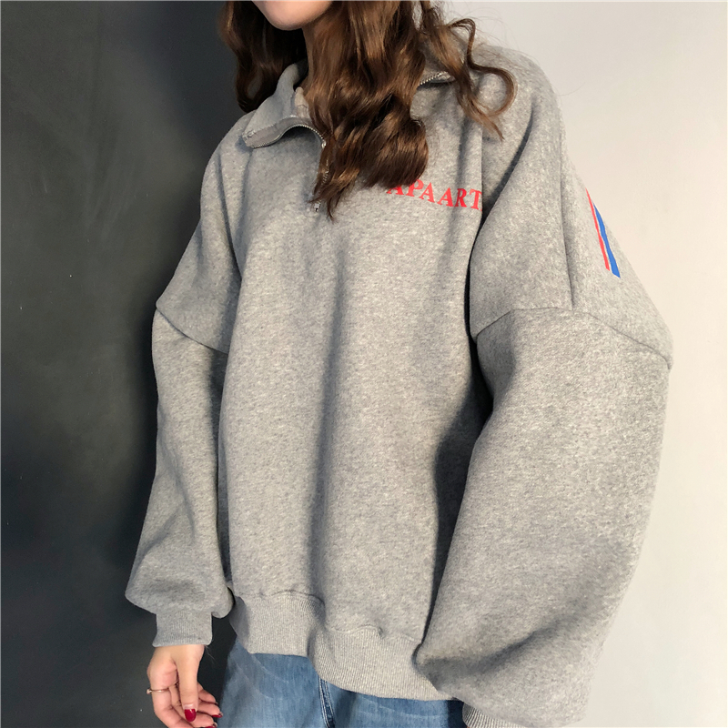 秋冬韓版原宿風寬松字母拉鏈翻領加絨加厚套頭超火衛衣上衣外套女