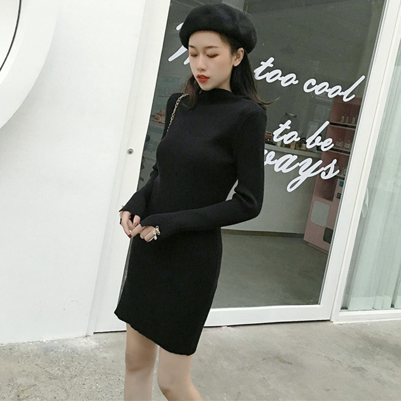 / 氣質修身顯瘦半高領針織連衣裙子女秋冬裝新款法式黑色egg桔梗裙