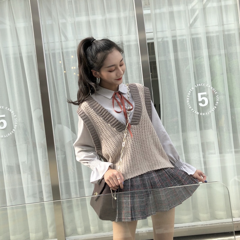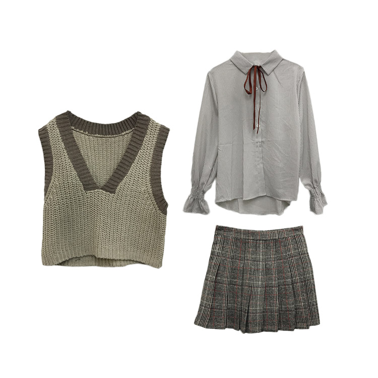淺卡其色 針織馬甲|米白色 針織馬甲|淺灰色 襯衫|淺藍色 襯衫|卡其色百褶裙內襯|藍色 百褶裙內襯