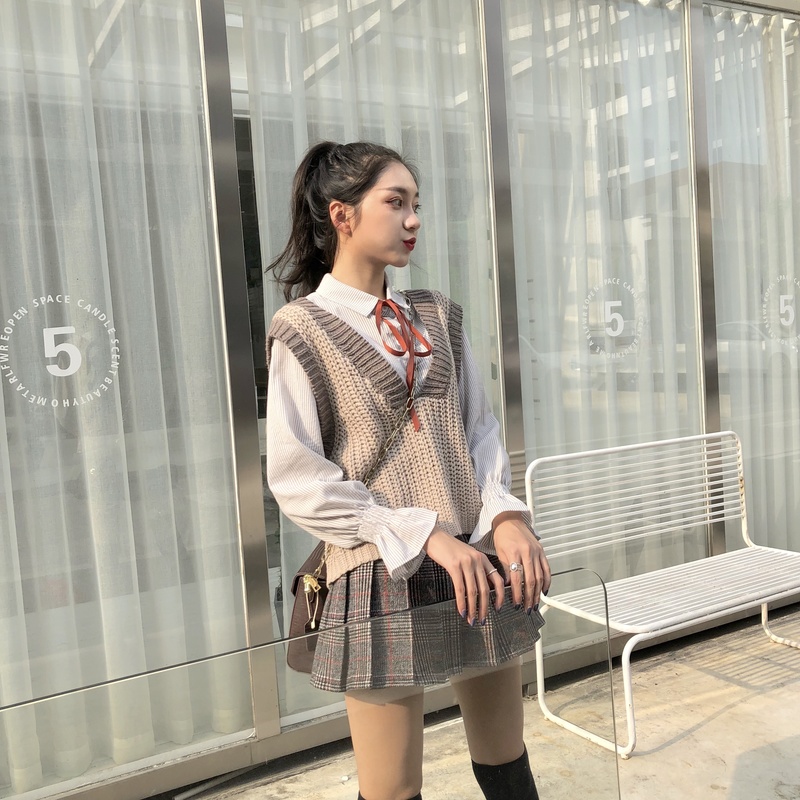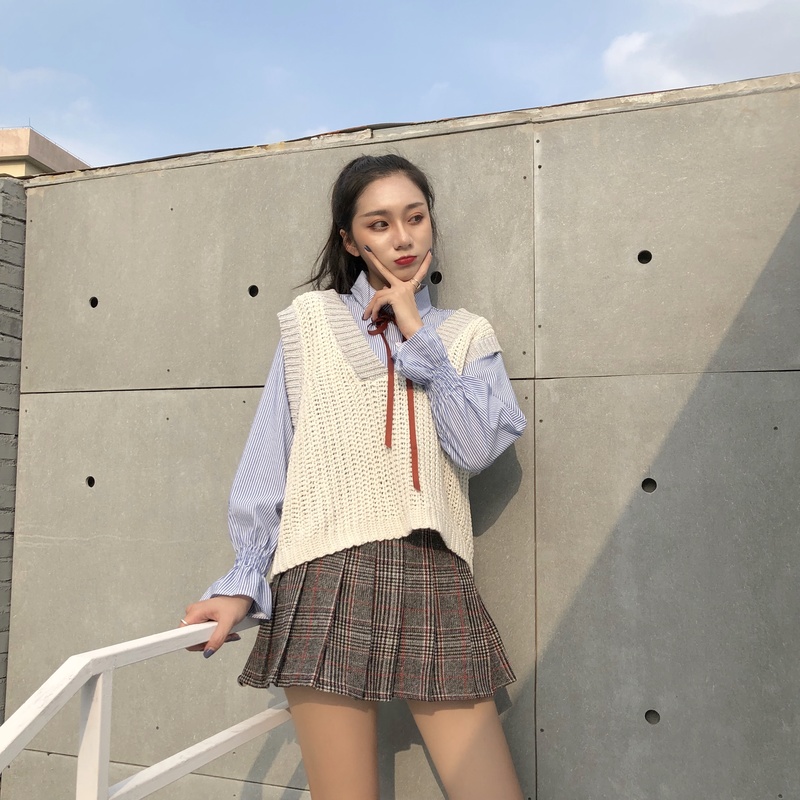 / 秋裝女2018新款套裝撞色針織馬甲女+花瓣袖條紋襯衫+百褶裙三件套