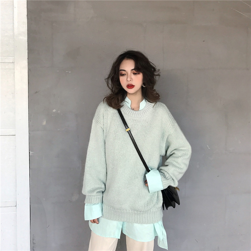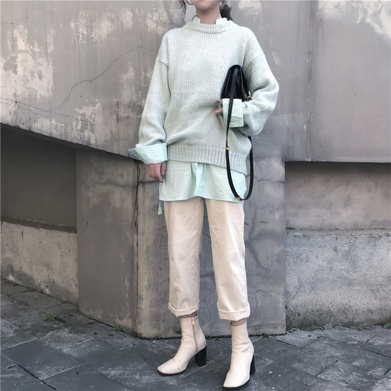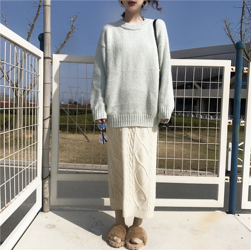 慵懶風套頭毛衣女2018新款秋冬百搭圓領長袖薄款薄荷綠針織衫上衣