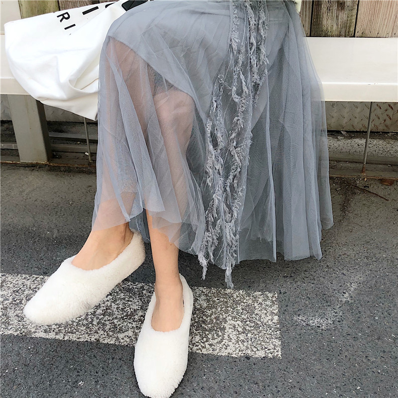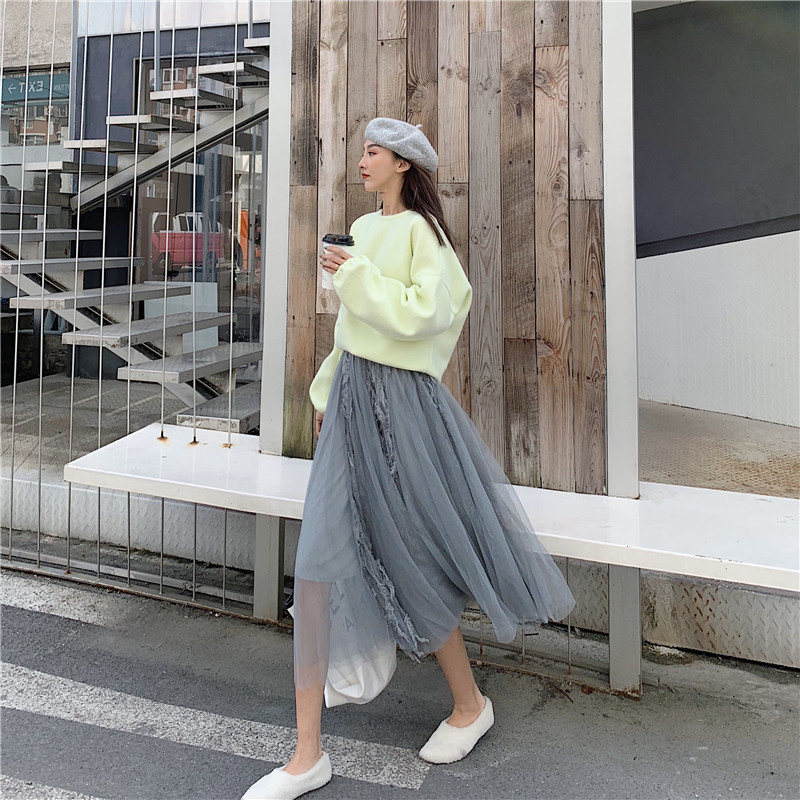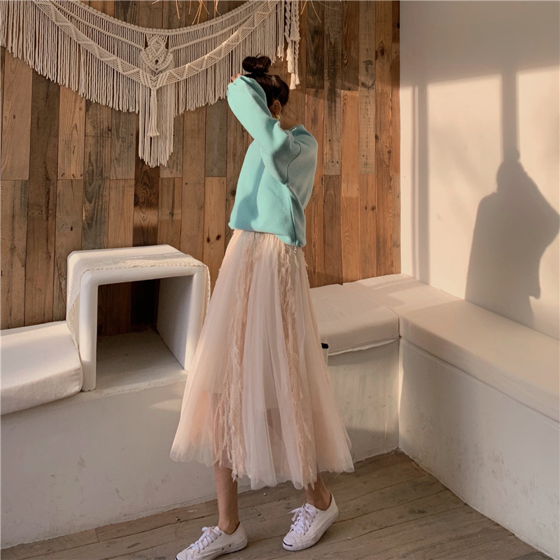2018秋冬新款氣質流蘇蕾絲拼接網紗半身裙女中長款高腰A字裙傘裙