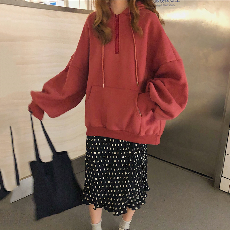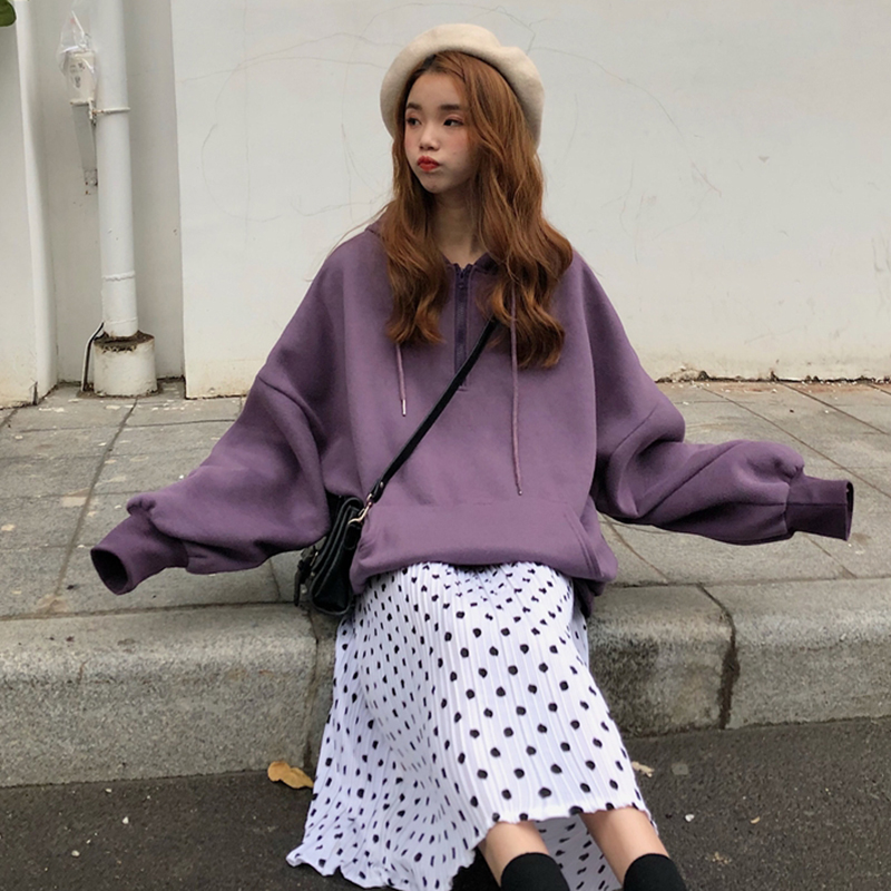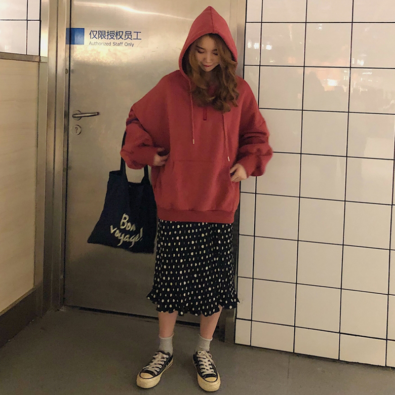 / 網紅兩件套女秋冬裝新款寬松加絨連帽衛衣時尚波點松緊高腰百褶裙