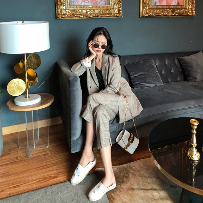 / 新款女格子西裝外套高腰百褶半身裙九分褲西褲三件套港風時尚套裝