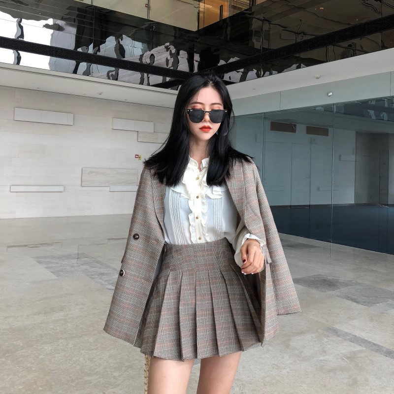 新款女格子西裝外套高腰百褶半身裙九分褲西褲三件套港風時尚套裝